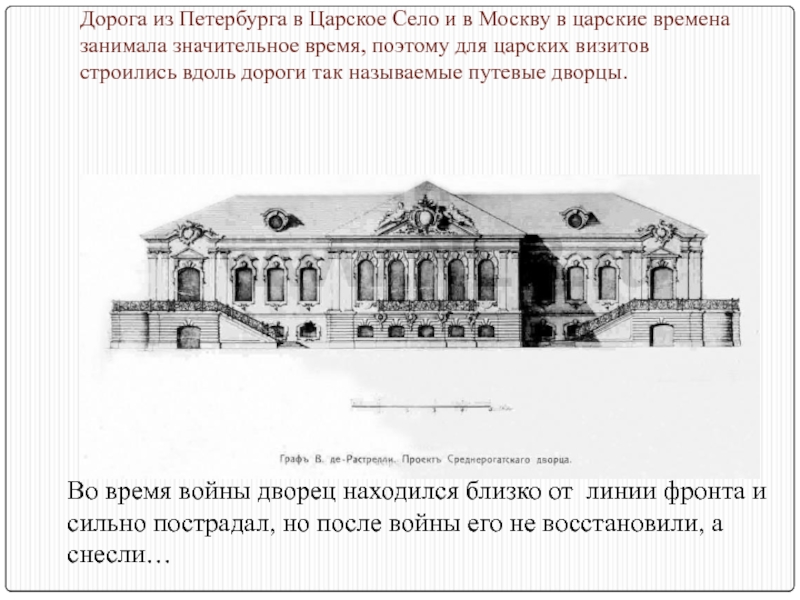 Во время войны дворец находился близко от линии фронта и сильно пострадал, но после войны его не восстановили, а снесли…