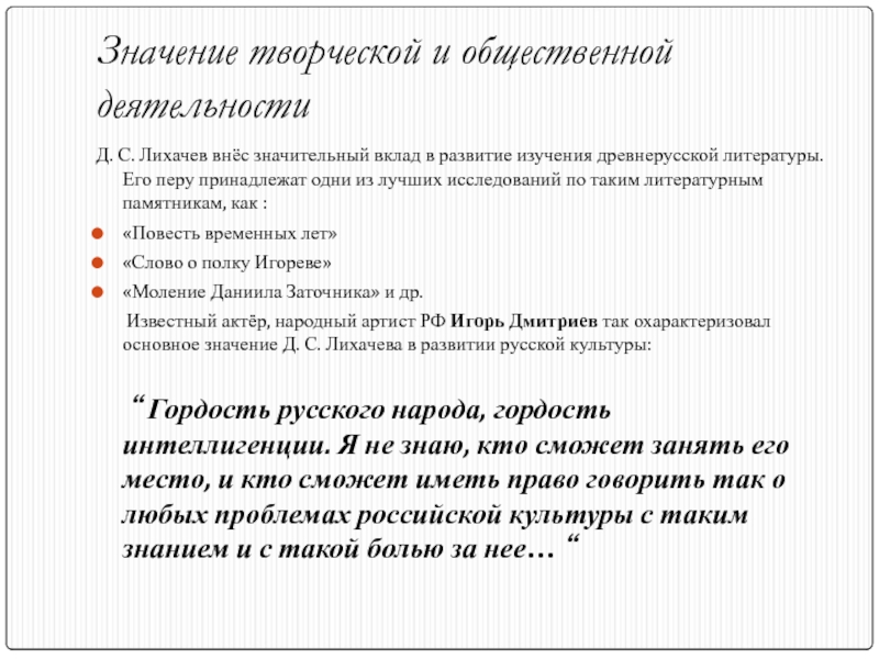 Известный актёр, народный артист РФ Игорь Дмитриев так охарактеризовал основное значение Д. С. Лихачева в развитии русской культуры: