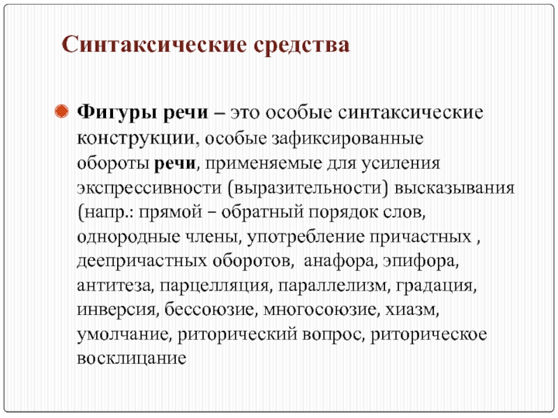 Синтаксические средства Фигуры речи – это особые синтаксические конструкции, особые зафиксированные обороты речи,