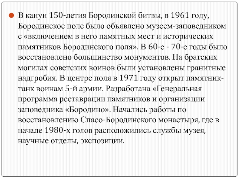 было объявлено музеем-заповедником с «включением в него памятных мест и исторических памятников Бородинского поля». В 60-е - 70-е годы было восстановлено большинство монументов. На братских могилах советских воинов были установлены гранитные надгробия. В центре поля в 1971 году открыт памятник-танк воинам 5-й армии. Разработана «Генеральная программа реставрации памятников и организации заповедника «Бородино». Начались работы по восстановлению Спасо-Бородинского монастыря, где в начале 1980-х годов расположились службы музея, научные отделы, экспозиции.