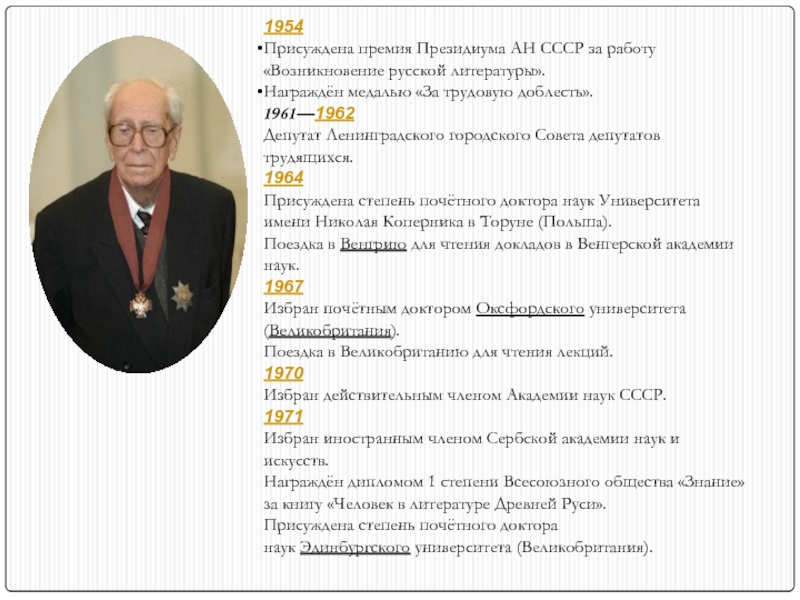 1954Присуждена премия Президиума АН СССР за работу «Возникновение русской литературы».Награждён медалью «За трудовую доблесть».1961—1962Депутат Ленинградского городского Совета