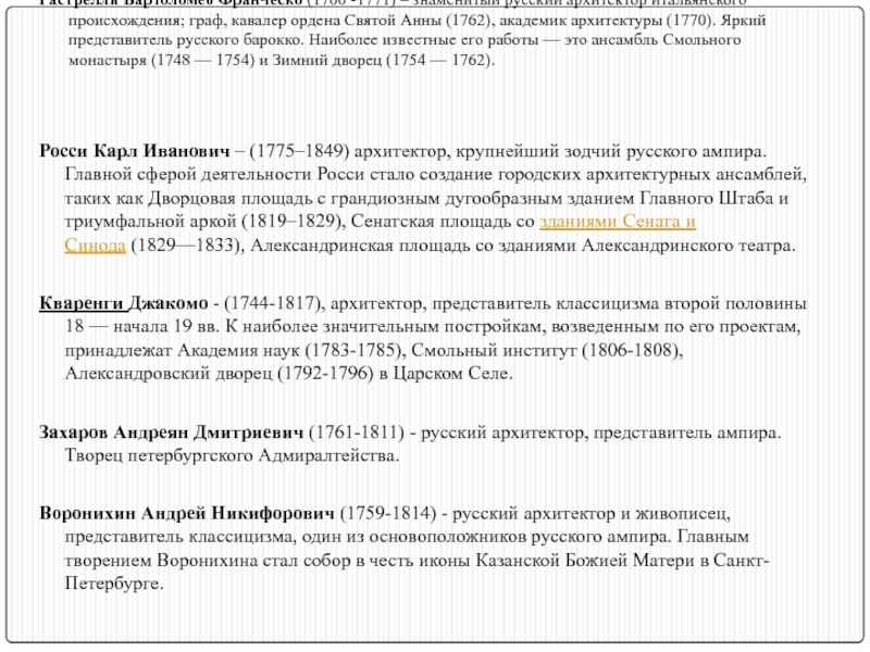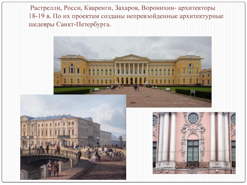 Слайд 16 Растрелли, Росси, Кваренги, Захаров, Воронихин- архитекторы 18-19 в. По их