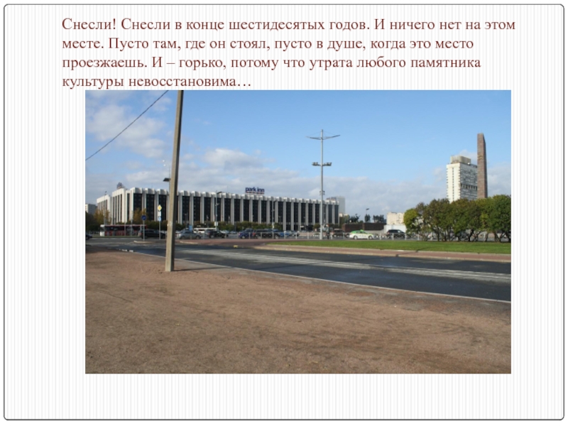 Слайд 19Снесли! Снесли в конце шестидесятых годов. И ничего нет на этом