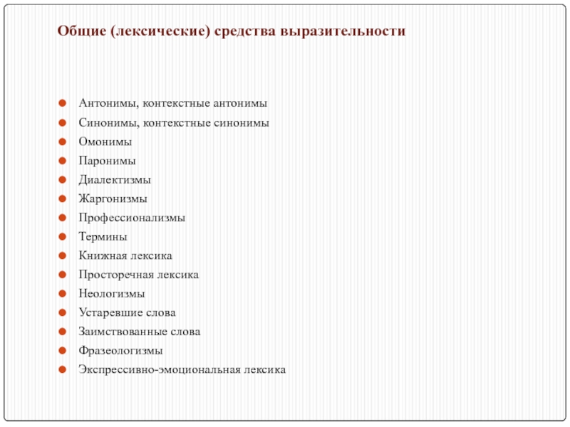 Общие (лексические) средства выразительности Антонимы, контекстные антонимыСинонимы, контекстные синонимыОмонимыПаронимыДиалектизмыЖаргонизмыПрофессионализмыТерминыКнижная лексикаПросторечная лексикаНеологизмыУстаревшие словаЗаимствованные словаФразеологизмыЭкспрессивно-эмоциональная лексика