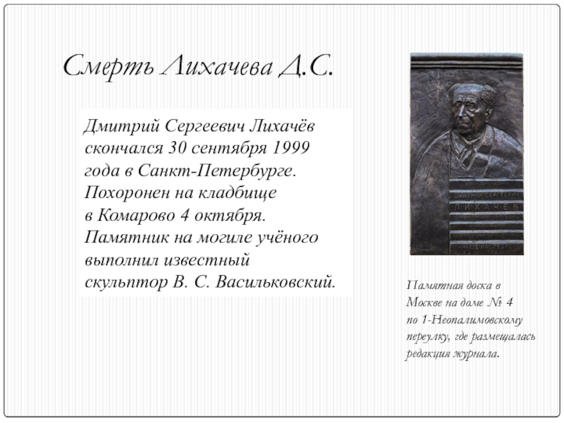 Смерть Лихачева Д.С.Памятная доска в Москве на доме № 4 по 1-Неопалимовскому переулку, где размещалась редакция журнала.Дмитрий Сергеевич