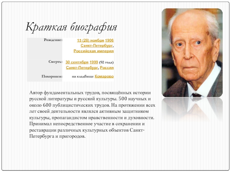 Выдающийся советский и российский филолог, искусствовед, сценарист, академик РАН (до 1991 — АНСССР). Имеет негласный титул «совести нации».Лихачев Дмитрий Сергеевич