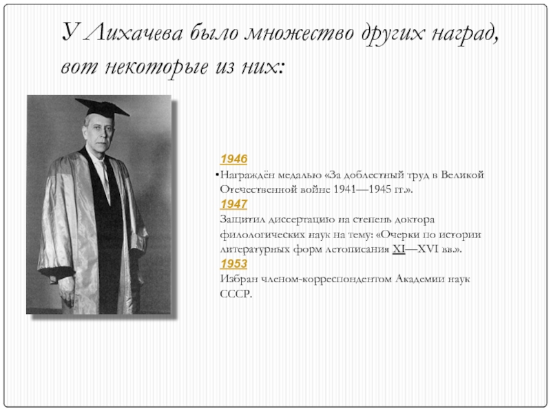 У Лихачева было множество других наград, вот некоторые из них:1946Награждён медалью «За доблестный труд в Великой