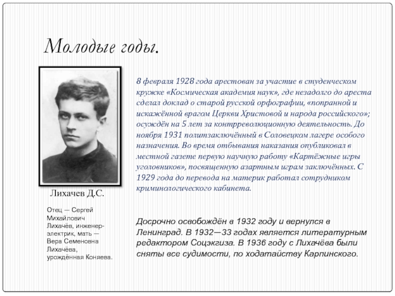 Молодые годы.Отец — Сергей Михайлович Лихачёв, инженер-электрик, мать — Вера Семеновна Лихачёва, урождённая Коняева.Лихачев Д.С.8 февраля 1928 года арестован за участие