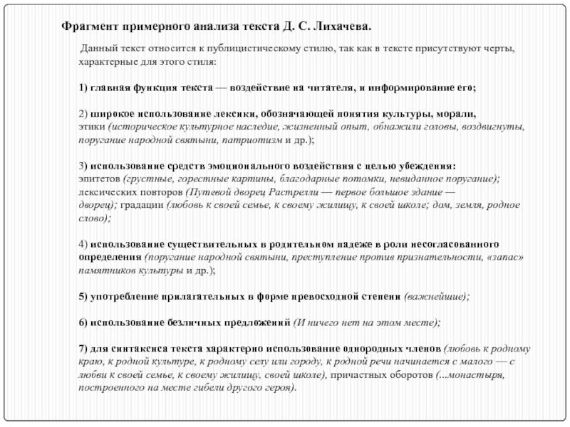 Фрагмент примерного анализа текста Д. С. Лихачева.    Данный текст относится к публицистическому стилю, так