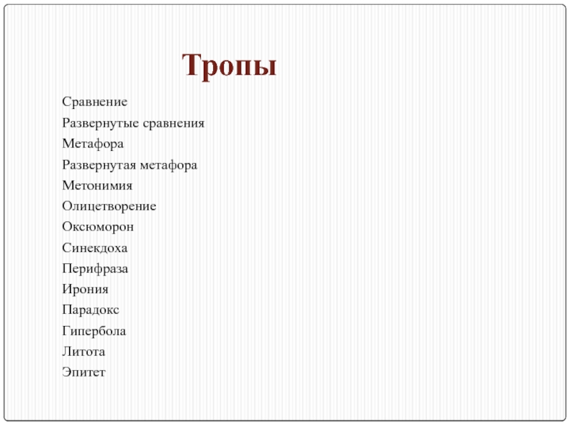 ТропыСравнениеРазвернутые сравненияМетафораРазвернутая метафораМетонимияОлицетворениеОксюморонСинекдохаПерифразаИронияПарадоксГиперболаЛитотаЭпитет