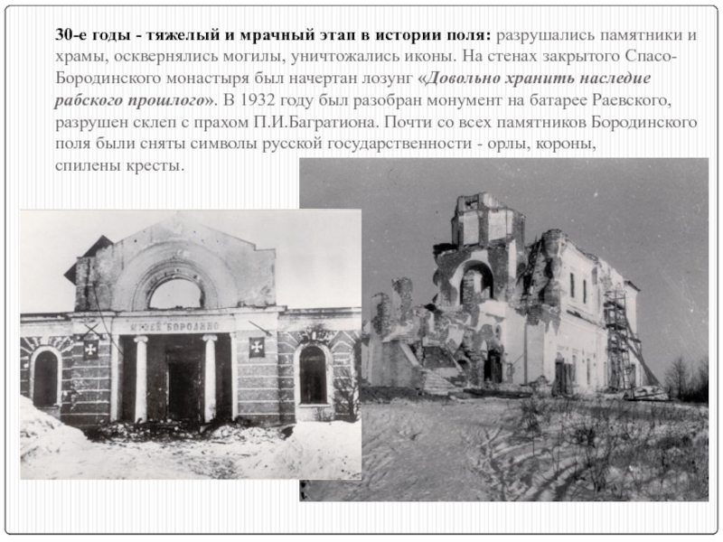 памятники и храмы, осквернялись могилы, уничтожались иконы. На стенах закрытого Спасо-Бородинского монастыря был начертан лозунг «Довольно хранить наследие рабского прошлого». В 1932 году был разобран монумент на батарее Раевского, разрушен склеп с прахом П.И.Багратиона. Почти со всех памятников Бородинского поля были сняты символы русской государственности - орлы, короны, спилены кресты.