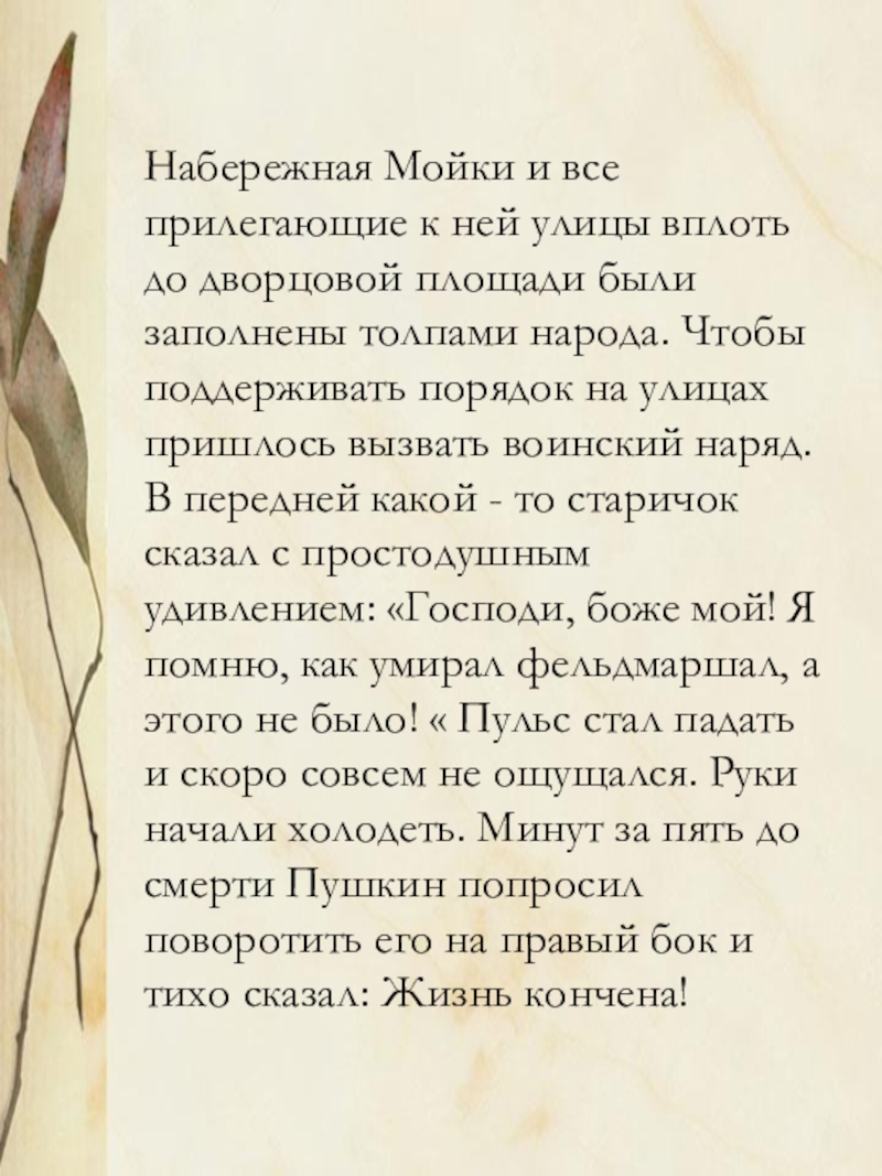 площади были заполнены толпами народа. Чтобы поддерживать порядок на улицах пришлось вызвать воинский наряд. В передней какой - то старичок сказал с простодушным удивлением: «Господи, боже мой! Я помню, как умирал фельдмаршал, а этого не было! « Пульс стал падать и скоро совсем не ощущался. Руки начали холодеть. Минут за пять до смерти Пушкин попросил поворотить его на правый бок и тихо сказал: Жизнь кончена!