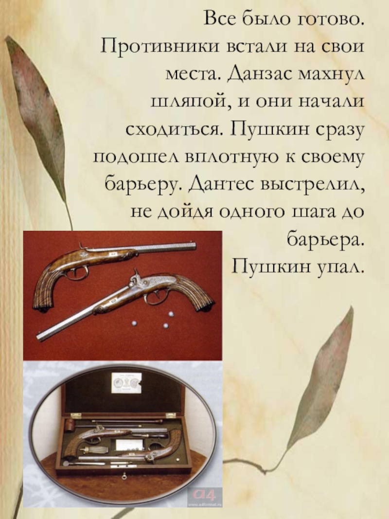 Слайд 6Все было готово. Противники встали на свои места. Данзас махнул шляпой,