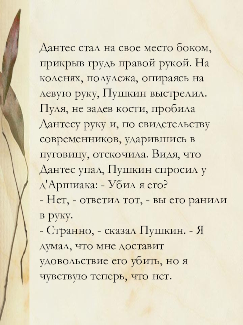коленях, полулежа, опираясь на левую руку, Пушкин выстрелил. Пуля, не задев кости, пробила Дантесу руку и, по свидетельству современников, ударившись в пуговицу, отскочила. Видя, что Дантес упал, Пушкин спросил у д'Аршиака: - Убил я его?