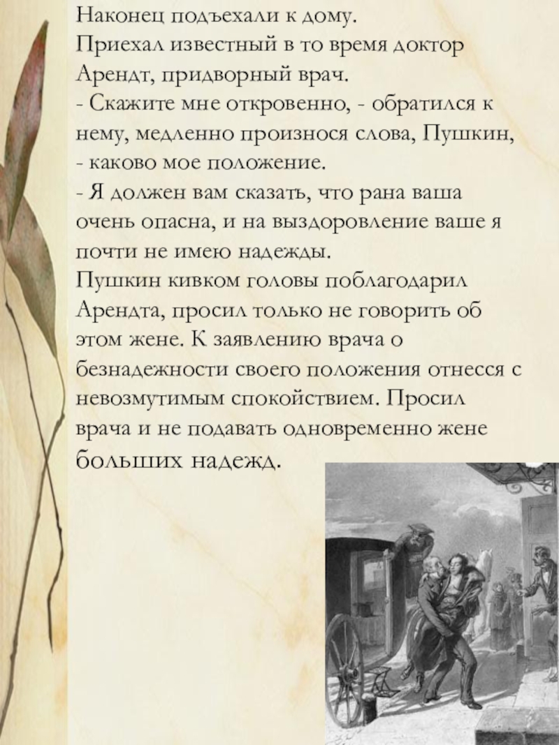 Пушкин кивком головы поблагодарил Арендта, просил только не говорить об этом жене. К заявлению врача о безнадежности своего положения отнесся с невозмутимым спокойствием. Просил врача и не подавать одновременно жене больших надежд.