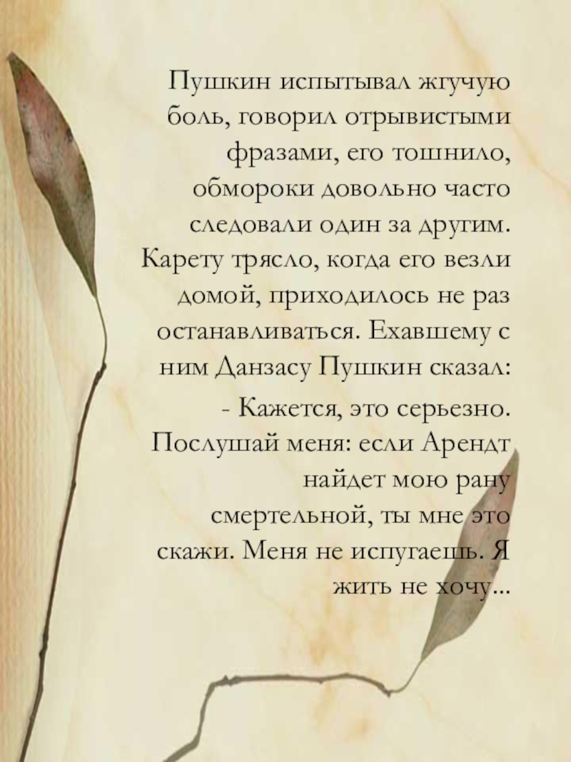 часто следовали один за другим. Карету трясло, когда его везли домой, приходилось не раз останавливаться. Ехавшему с ним Данзасу Пушкин сказал: