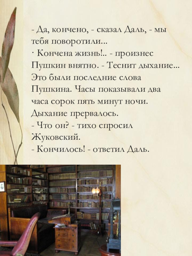 Это были последние слова Пушкина. Часы показывали два часа сорок пять минут ночи. Дыхание прервалось.