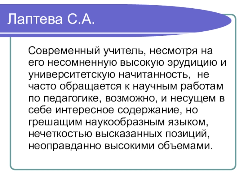 и университетскую начитанность, не часто обращается к научным работам по педагогике, возможно, и несущем в себе интересное содержание, но грешащим наукообразным языком, нечеткостью высказанных позиций, неоправданно высокими объемами.