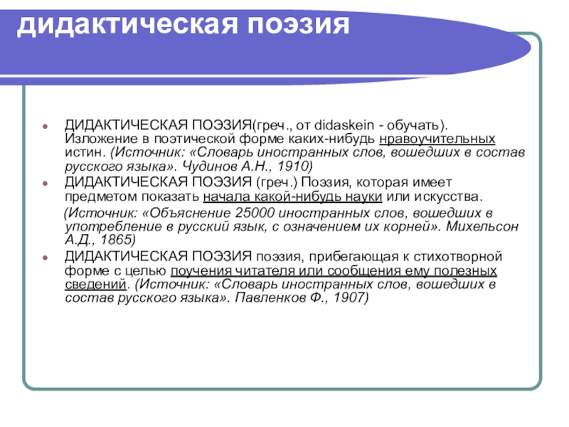 ДИДАКТИЧЕСКАЯ ПОЭЗИЯ поэзия, прибегающая к стихотворной форме с целью поучения читателя или сообщения ему полезных сведений. (Источник: «Словарь иностранных слов, вошедших в состав русского языка». Павленков Ф., 1907)