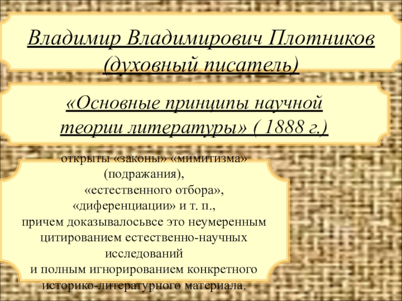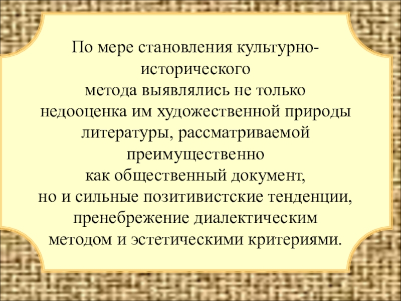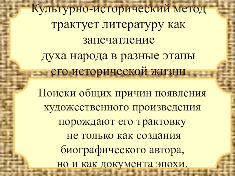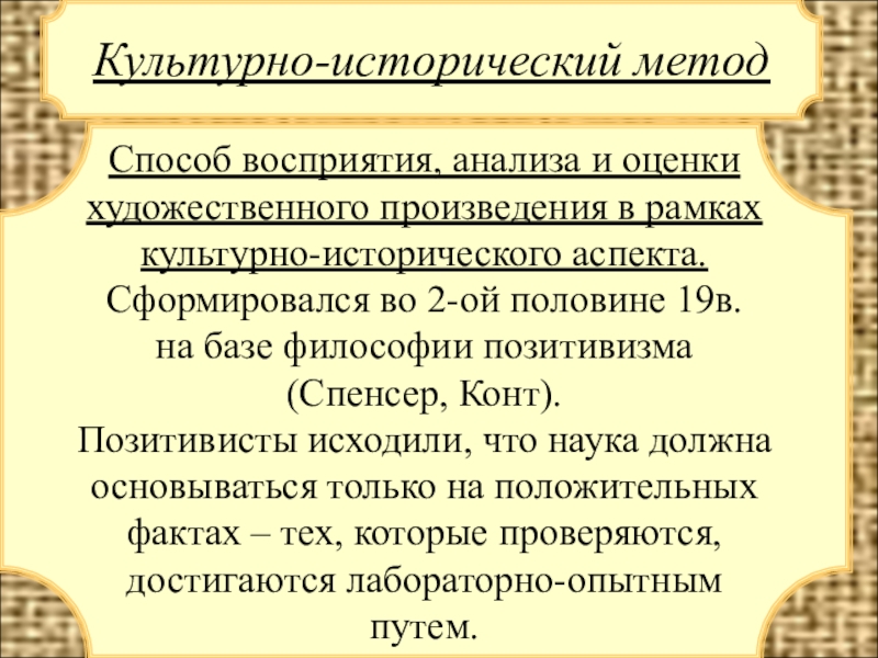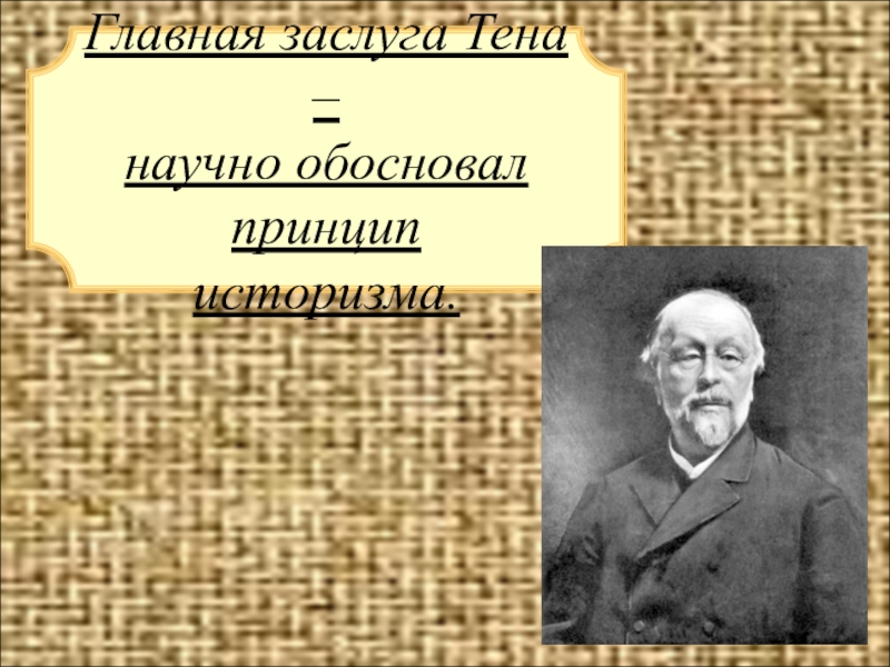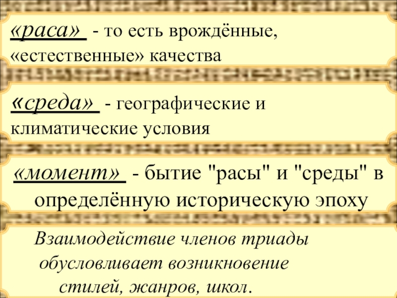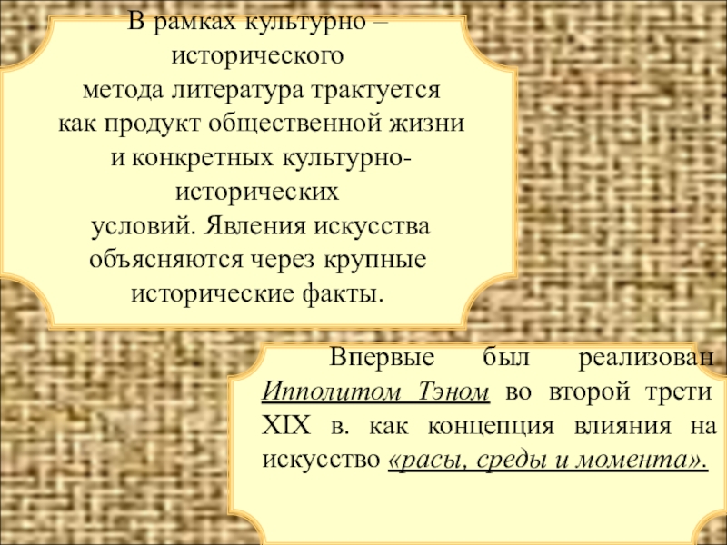 Впервые был реализован Ипполитом Тэном во второй трети XIX в. как концепция влияния на искусство «расы, среды и момента».