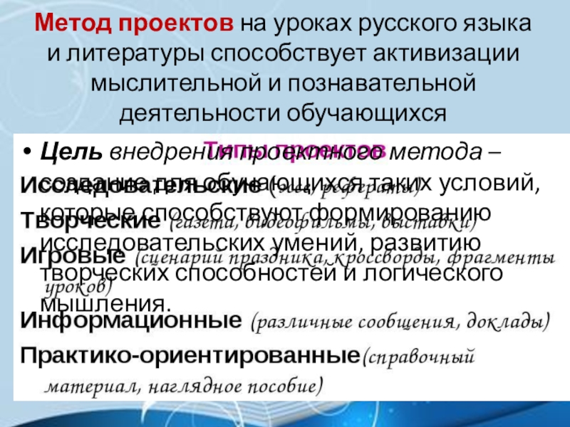 Цель внедрения проектного метода – создание для обучающихся таких условий, которые способствуют формированию исследовательских умений, развитию творческих способностей и логического мышления.