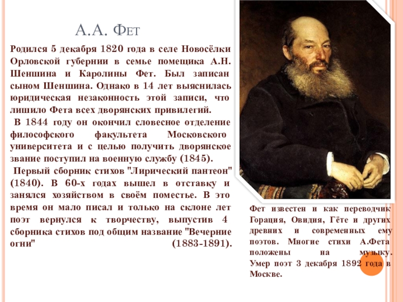 Фет известен и как переводчик Горация, Овидия, Гёте и других древних и современных ему поэтов. Многие стихи А.Фета положены на музыку.