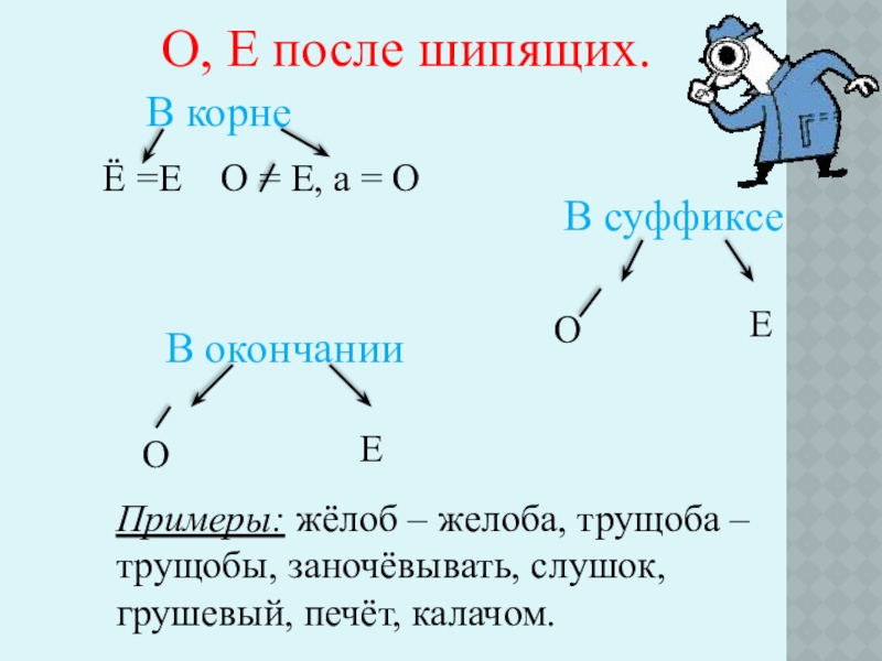 Примеры: жёлоб – желоба, трущоба – трущобы, заночёвывать, слушок, грушевый, печёт, калачом.