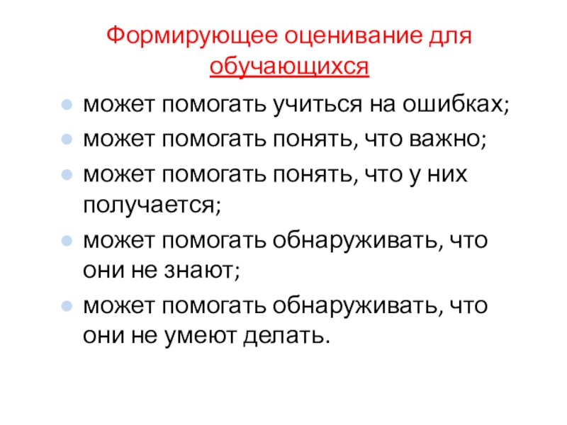 Формирующим данный вид оценивания называется потому, что оценка ориентирована на конкретного ученика, призвана выявить пробелы в освоении учащимся элемента содержания образования с тем, чтобы восполнить их с максимальной эффективностью.