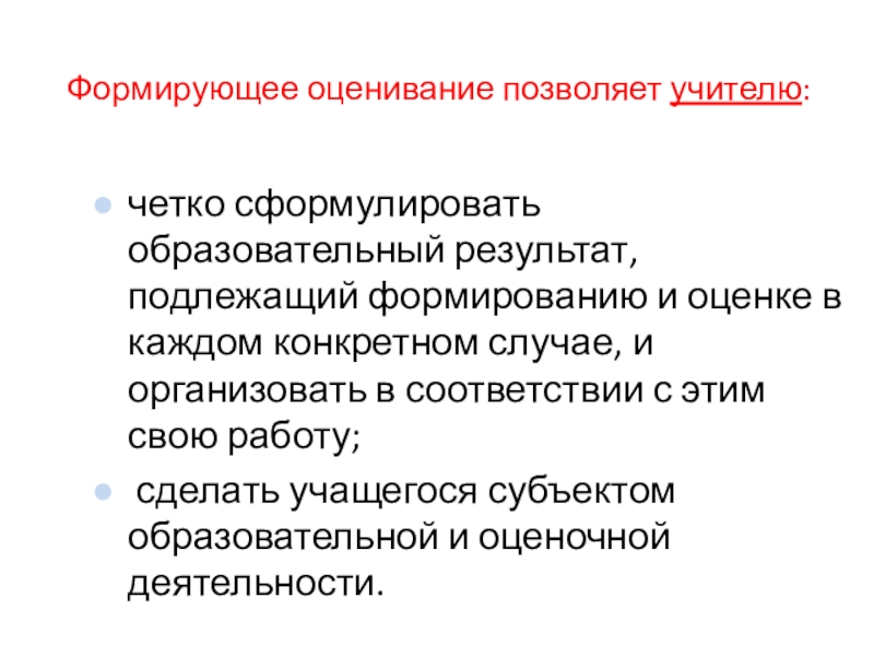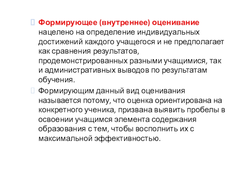 Формирующее (внутреннее) оценивание нацелено на определение индивидуальных достижений каждого учащегося и