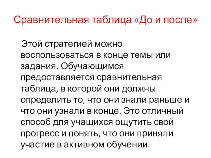 конце темы или задания. Обучающимся предоставляется сравнительная таблица, в которой они должны определить то, что они знали раньше и что они узнали в конце. Это отличный способ для учащихся ощутить свой прогресс и понять, что они приняли участие в активном обучении.