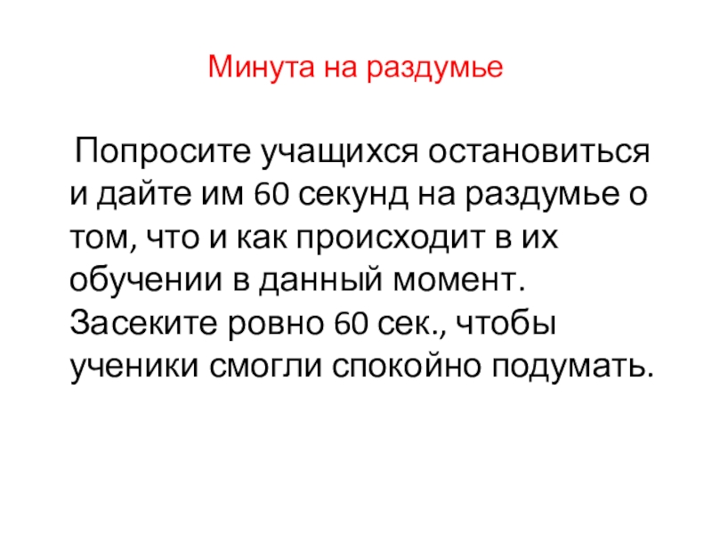 секунд на раздумье о том, что и как происходит в их обучении в данный момент. Засеките ровно 60 сек., чтобы ученики смогли спокойно подумать.