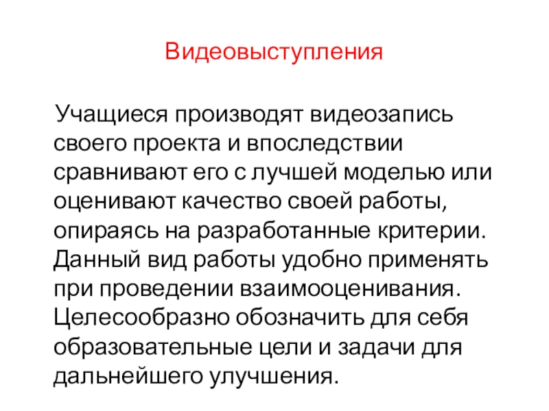 с лучшей моделью или оценивают качество своей работы, опираясь на разработанные критерии. Данный вид работы удобно применять при проведении взаимооценивания. Целесообразно обозначить для себя образовательные цели и задачи для дальнейшего улучшения.
