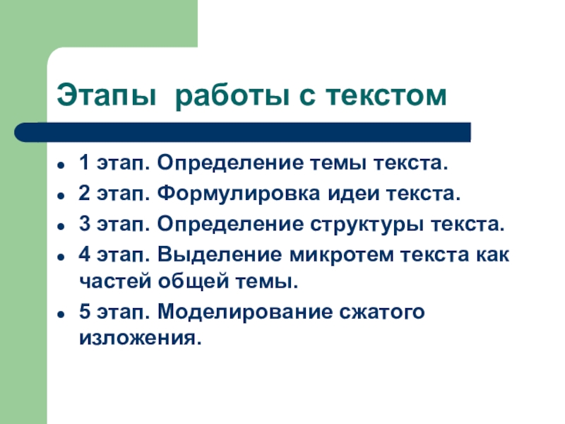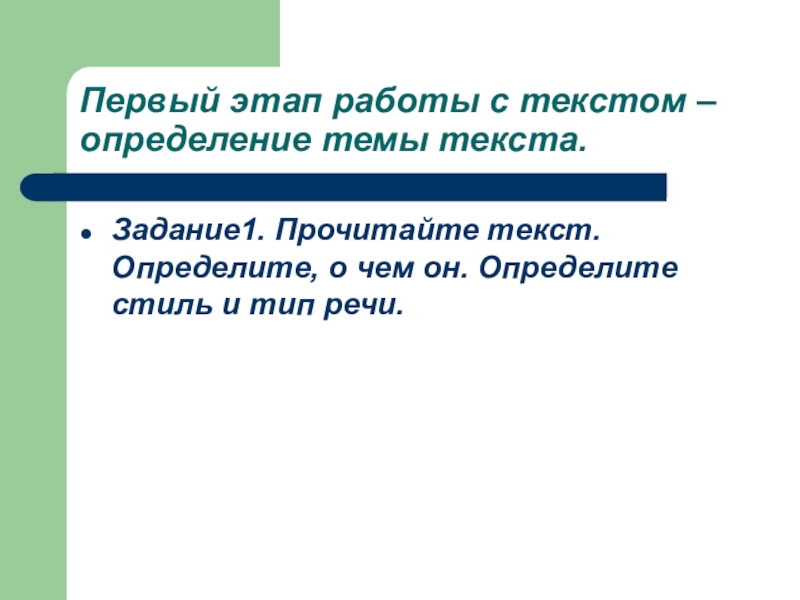 Слайд 13Первый этап работы с текстом – определение темы текста.