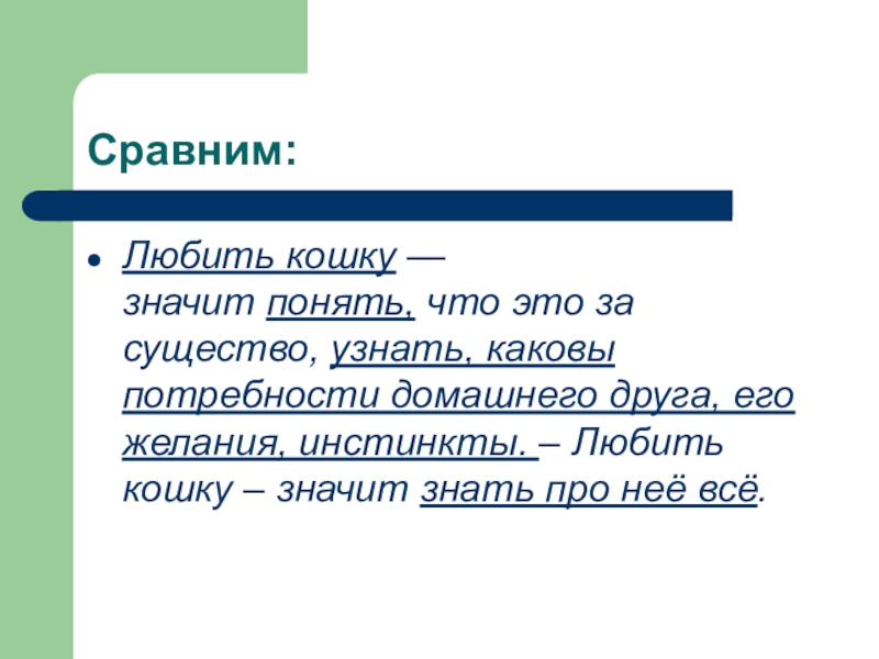 Любить кошку — значит знать о ней всё и с уважением относиться к этим удивительным животным. (15 слов)