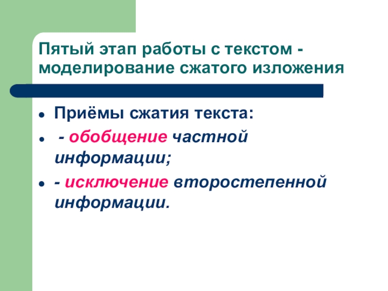 Слайд 17Пятый этап работы с текстом - моделирование сжатого изложения