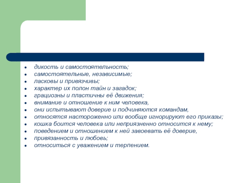 Кошки нас привлекают тем, что общение с ними доставляет радость. Независимые, они не всегда легко контактируют с человеком. Они больше привыкают к дому, чем к хозяину. Кошки умны и загадочны. Тем, кто не держал дома кошку, трудно представить, сколько в ней таинственной прелести. (43 слова)