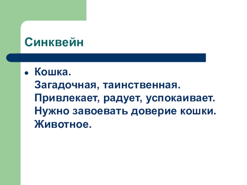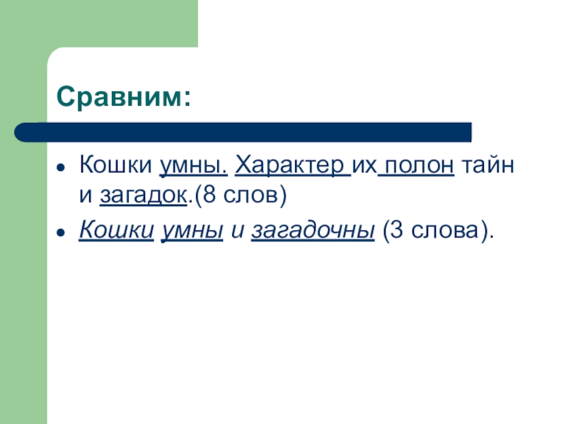 Кошки умны. Характер их полон тайн и загадок.(8 слов)