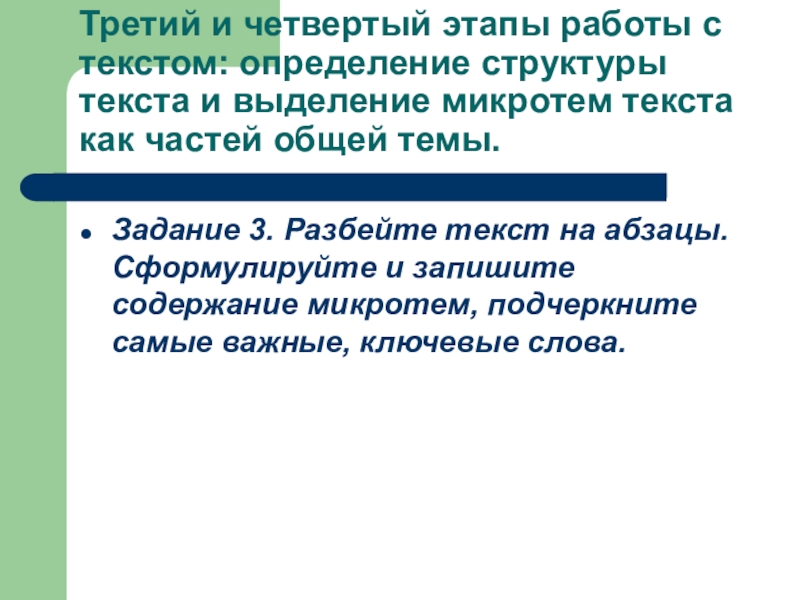 Слайд 15Третий и четвертый этапы работы с текстом: определение структуры текста и