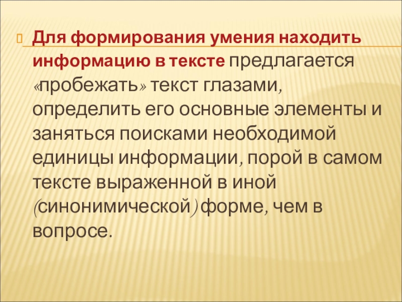 Слайд 7Для формирования умения находить информацию в тексте предлагается «пробежать» текст глазами,