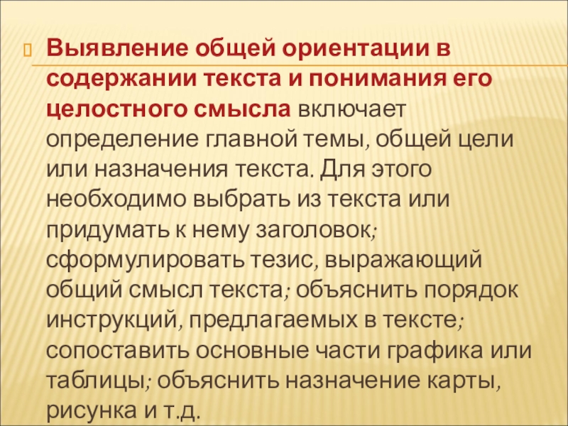 Слайд 5Выявление общей ориентации в содержании текста и понимания его целостного смысла