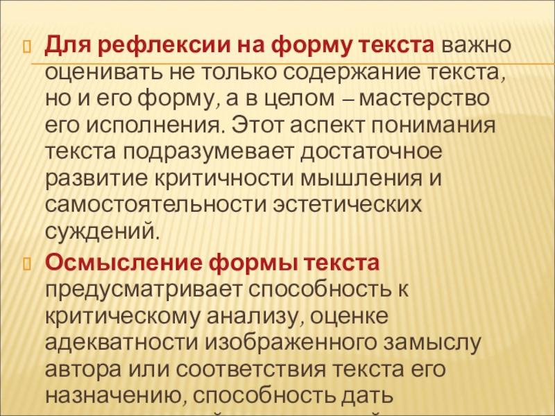 Слайд 10Для рефлексии на форму текста важно оценивать не только содержание текста,