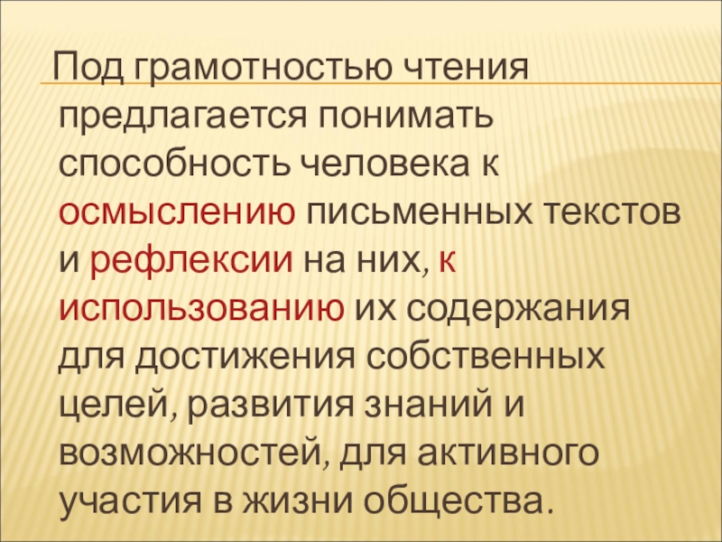 письменных текстов и рефлексии на них, к использованию их содержания для достижения собственных целей, развития знаний и возможностей, для активного участия в жизни общества.