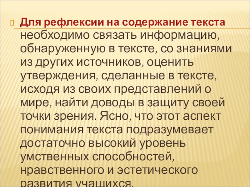 со знаниями из других источников, оценить утверждения, сделанные в тексте, исходя из своих представлений о мире, найти доводы в защиту своей точки зрения. Ясно, что этот аспект понимания текста подразумевает достаточно высокий уровень умственных способностей, нравственного и эстетического развития учащихся.
