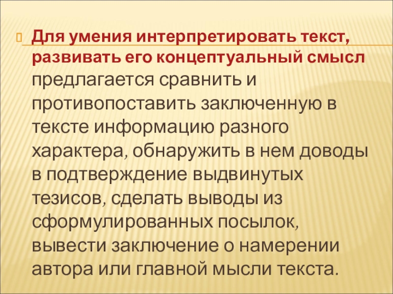 Слайд 8Для умения интерпретировать текст, развивать его концептуальный смысл предлагается сравнить и