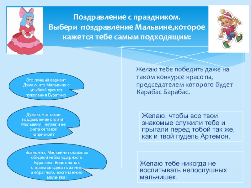 Выбери поздравление Мальвине,которое кажется тебе самым подходящим: