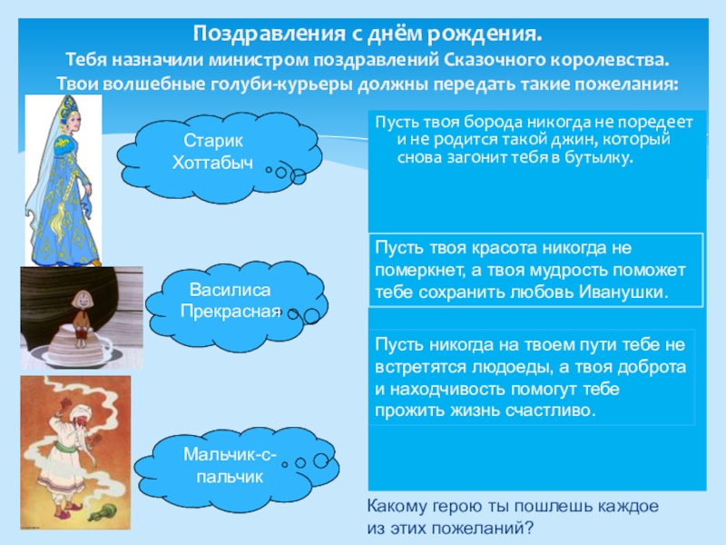 Какому герою ты пошлешь каждое из этих пожеланий?