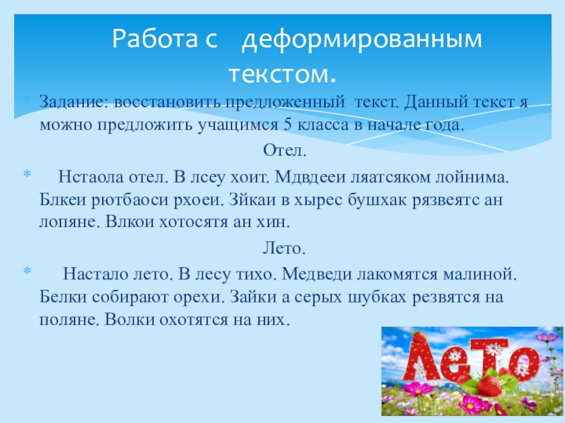 Задание: прочитайте текст, обратив особое внимание на слова и выражения, передающие действия животных, восстановите текст по памяти, имея перед глазами вариант с пропусками (пропущенные впоследствии слова и выражения в тексте выделены курсивом).