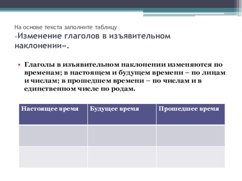Глаголы в изъявительном наклонении изменяются по временам; в настоящем и будущем времени – по лицам и числам; в прошедшем времени – по числам и в единственном числе по родам.