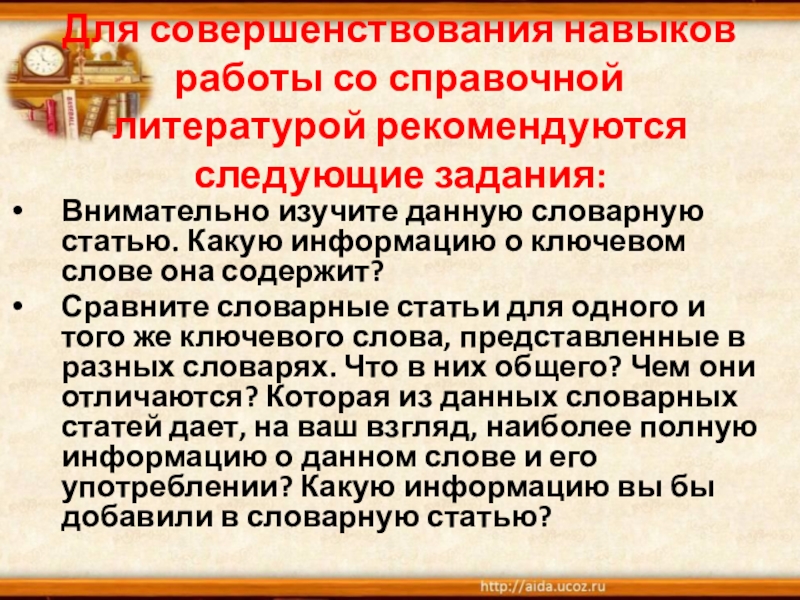 Для совершенствования навыков работы со справочной литературой рекомендуются следующие задания: