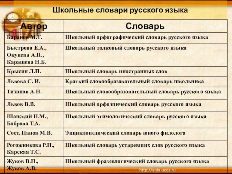 (который называется словарь “Пиши правильно”), 2) толковый (так и называется), 3) этимологический (“Словарь происхождения слов”), 4) орфоэпический (словарь “Произноси правильно”), 5) обратный (так и называется)